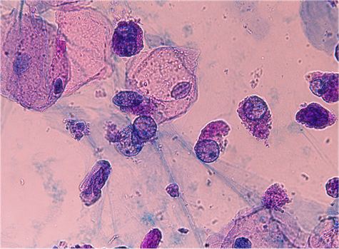 円形・類円形 N/C比大を示し、核はスリガラス様を呈しクロマチンは融解状