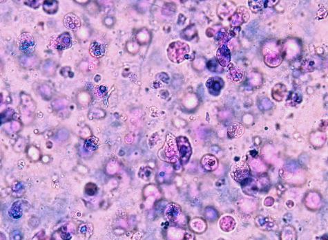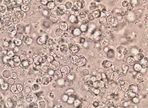 細胞質内に封入体を含有する。白血球との鑑別が必要。プレスコットブロディー染色が有効