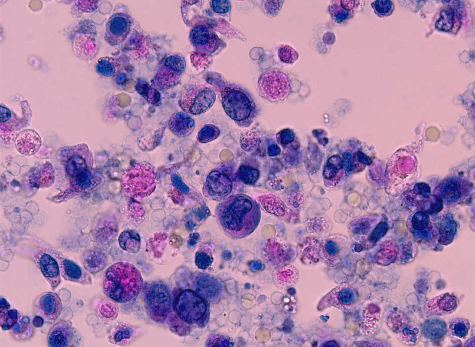核縁の肥厚と核の不整が認められる。核小体が認められクロマチン増量