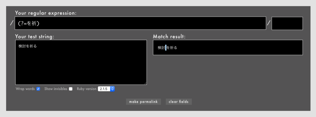 これはあえて先読みだけを記述したものです。「検討」と「を祈る」の間、つまり文字と文字の「間」にマッチしていることにご注目ください。これが「位置」です。