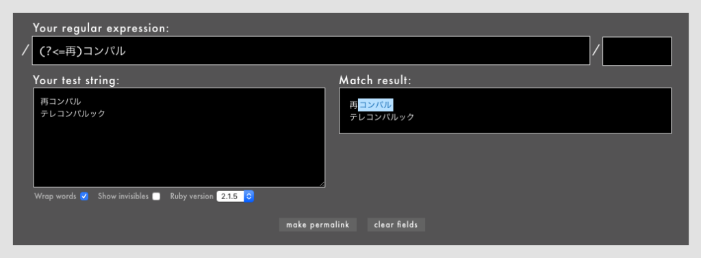 (?<=正規表現)正規表現がある場合にのみマッチさせたい正規表現はマッチに含めたくない(?<!正規表現)正規表現がある場合にのみマッチから除外したい正規表現はマッチに含めたくない(?<=再)コンパル/というパターン