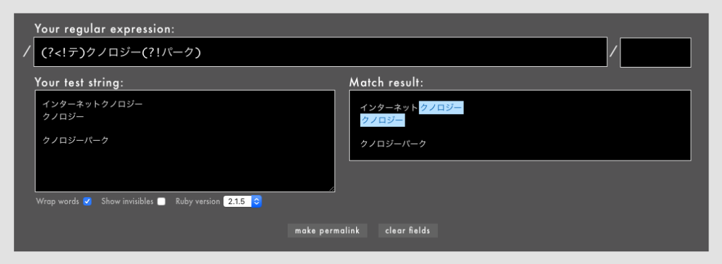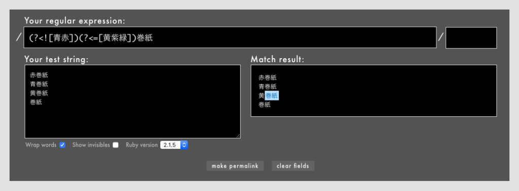 正規表現の先読み・後読みは言葉で説明するとわかりづらいので、具体例から先に学ぶのがよいと思います。Rubularの実行例を用意しましたので、ぜひ自分で動かして遊んでみましょう。