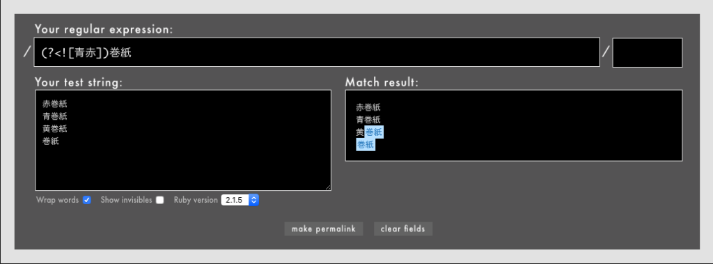 上の例では、「黄巻紙」以外に単なる「巻紙」にまでマッチしてしまいました。改行文字や非文字(冒頭位置や末尾位置など)も/(?<![青赤])巻紙/に該当するからです。
