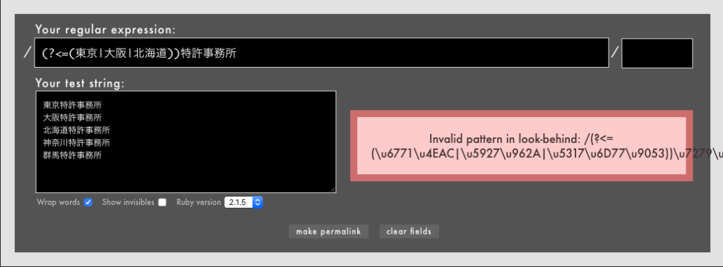 また、Rubyの否定後読みでは、長さが同じであっても/(?<!(東京|大阪))特許事務所/という書き方自体が許されません。否定後読みの中で()を使うだけでもエラーになります(ちょっと厳しすぎる気もします)。