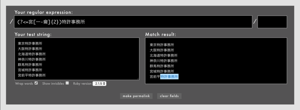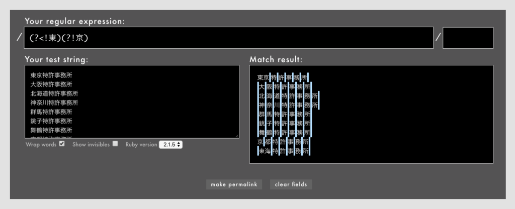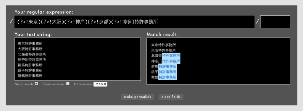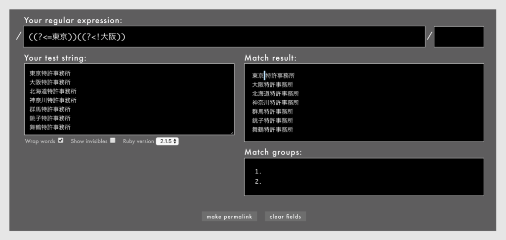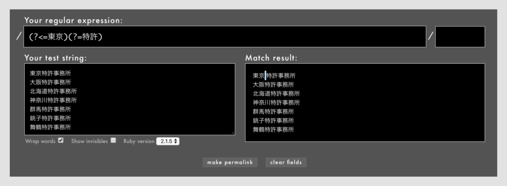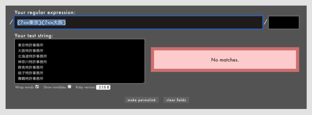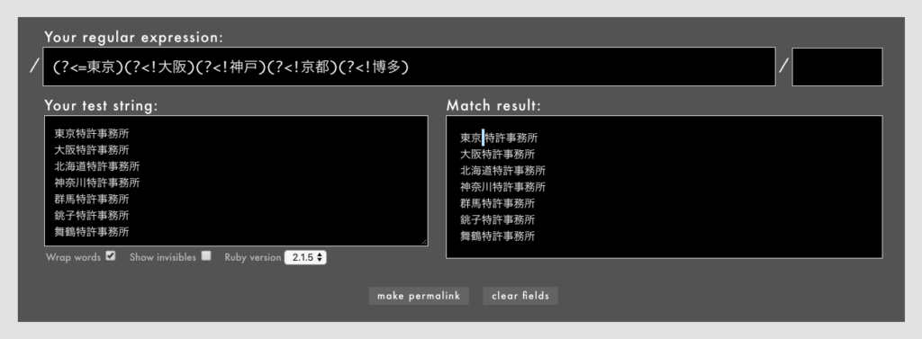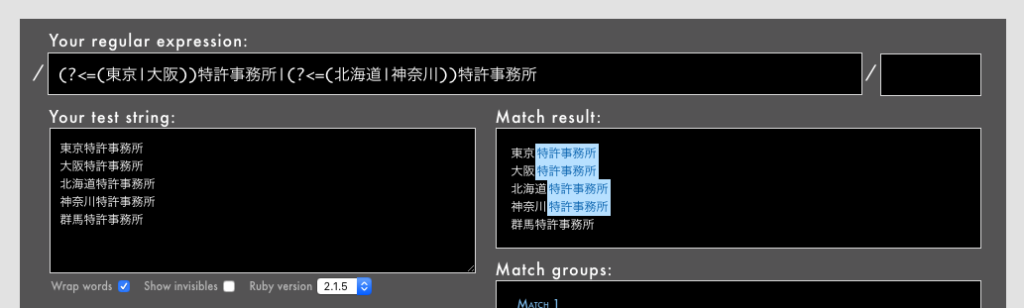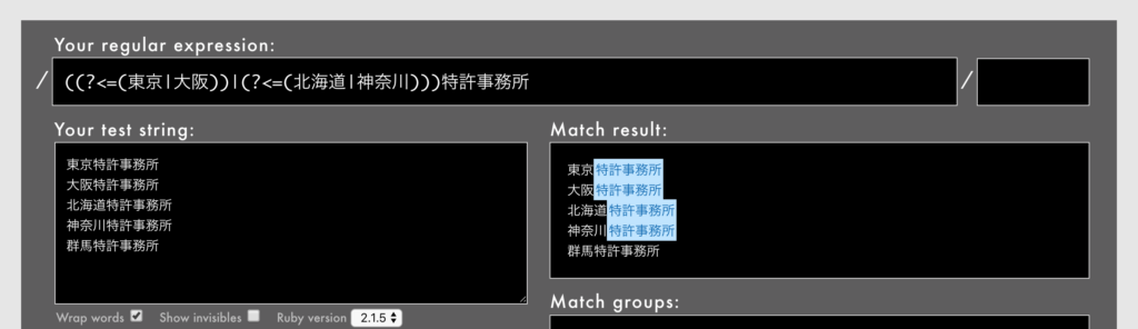 (?<=(東京|大阪))特許事務所|(?<=(北海道|神奈川))特許事務所/というパターン(Rubular)