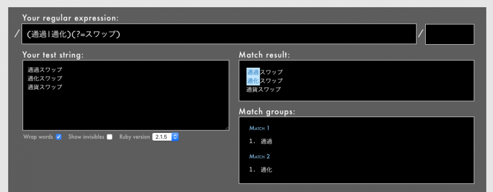 上の例は、「通過スワップ」というタイポの「通過」、または「通化スワップ」というタイポの「通化」にマッチします。それ以外にはマッチしません。